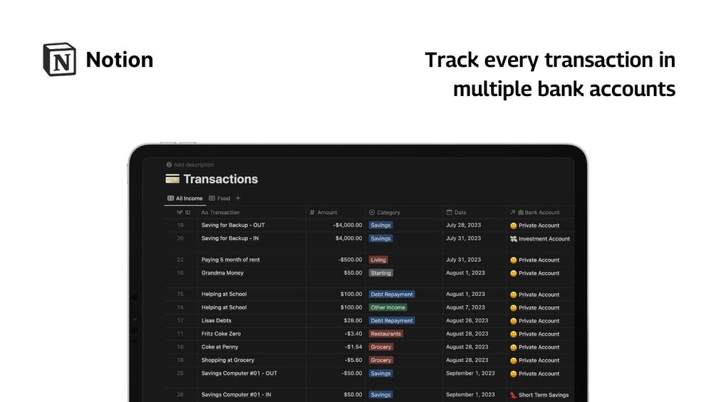 • Bank Accounts: Track everything in multiple bank accounts (saving, invest, cash, ...)