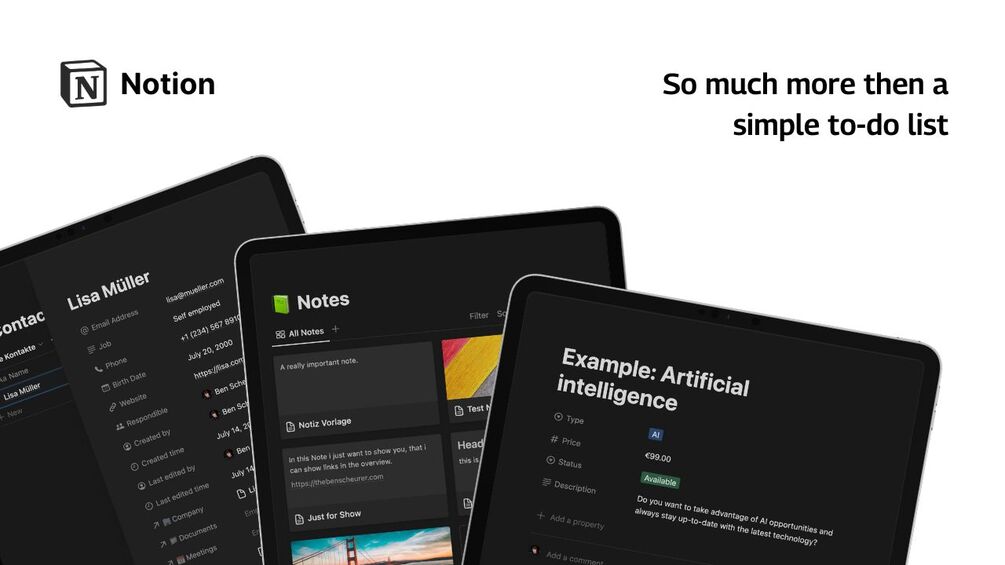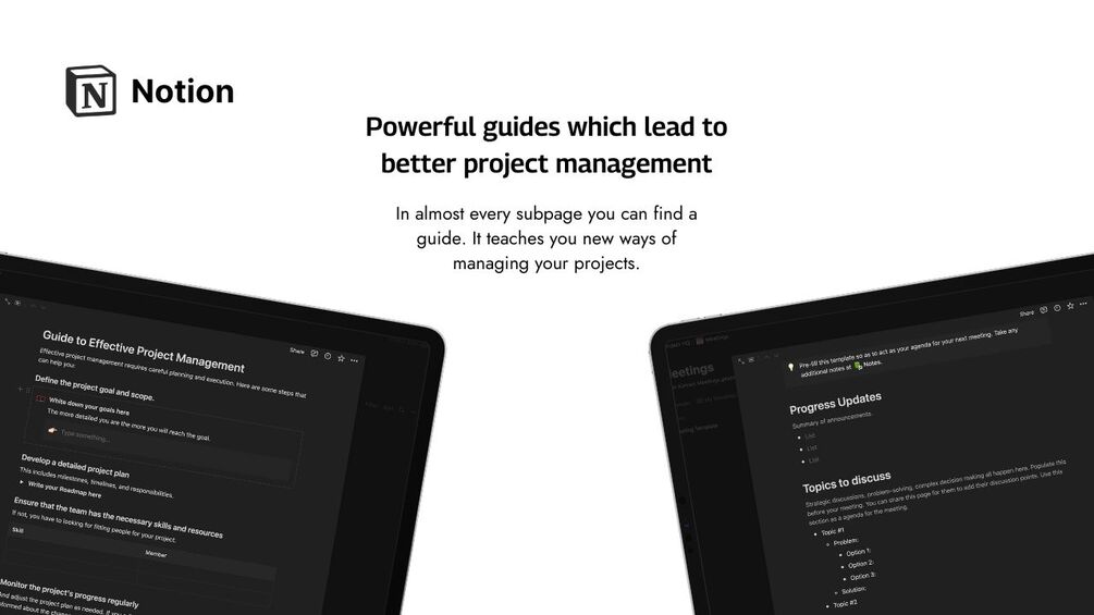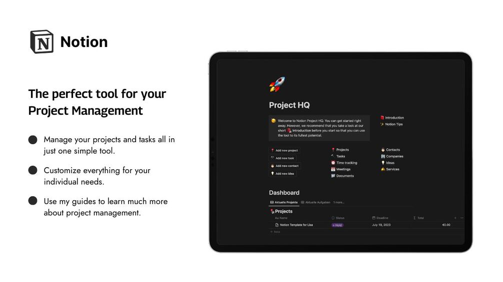 The whole template is full of guides. They help you to get better in project planing, task management and running a service business. I show ways to interact with the template on Instagram and TikTok. There you find inspirations how the template can used by you.